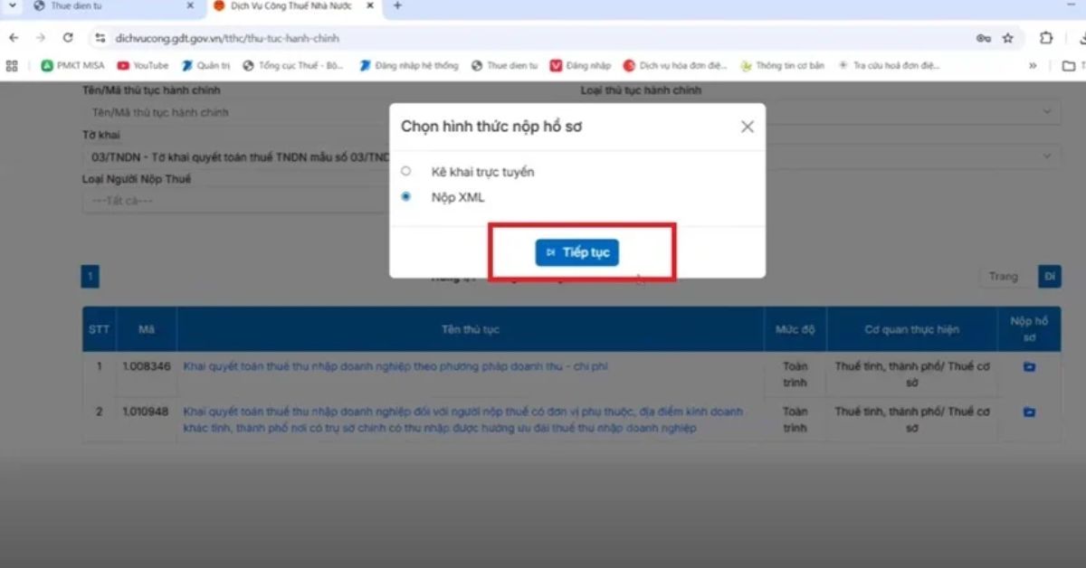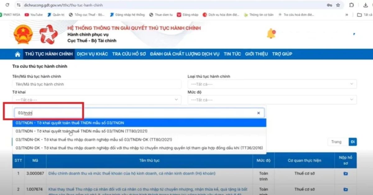 Bước 4: Chọn thủ tục quyết toán thuế TNDN