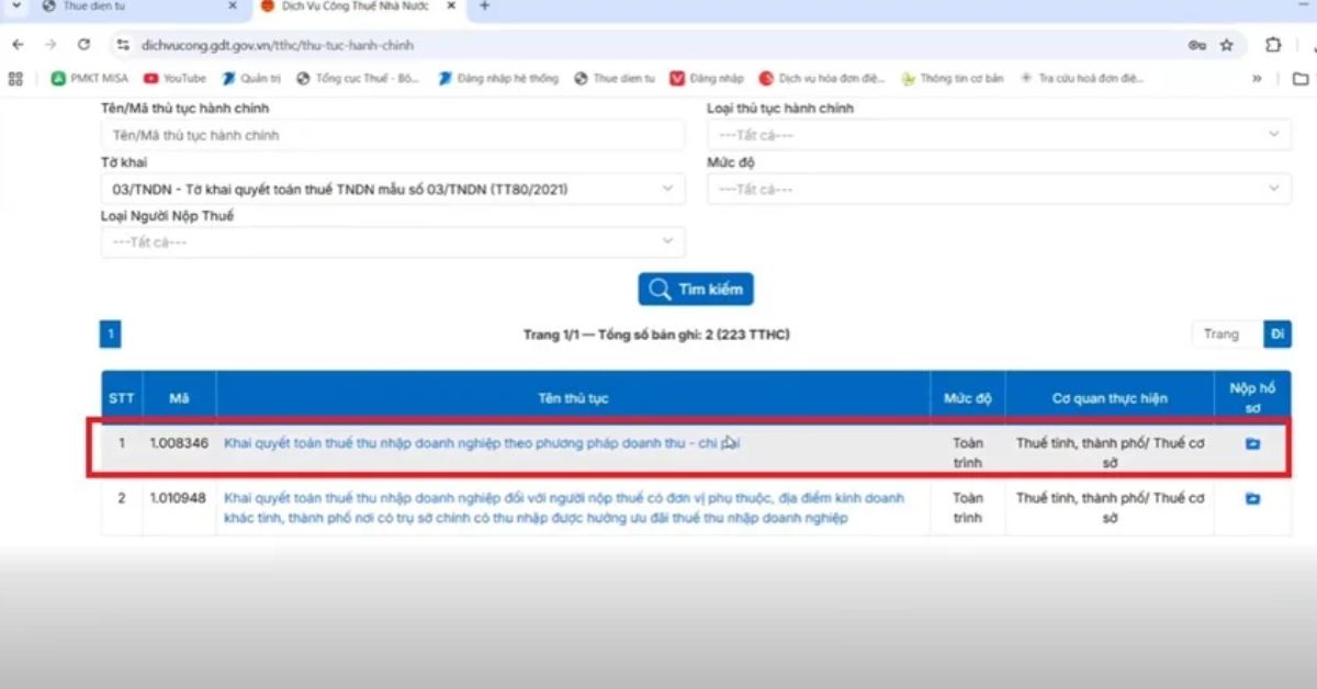 Mã thủ tục: 1.008346 – “Khai quyết toán thuế thu nhập doanh nghiệp theo phương pháp doanh thu – chi phí”. Sau đó nhấn Nộp hồ sơ để bắt đầu tạo hồ sơ điện tử.